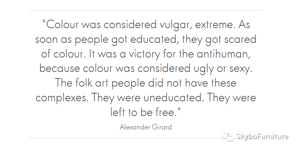 Girard的作品給人最直接的印象,大概就是其鮮艷的色彩與豐富的圖案。他在追求一種現(xiàn)代性,而他的追求,顯然有別于美國(guó)1960年代開(kāi)始盛行的“極少主義”(minimalism)美學(xué)。Girard所鐘情的色彩和圖案可以歸因于他對(duì)民俗藝術(shù)(folk?art)的熱愛(ài)。Girard還有一個(gè)身份是民俗藝術(shù)品收藏家。他與妻子Susan?Girard在常年的旅行中(旅行也成為工作的一部分),收集了來(lái)自世界各地的民俗藝術(shù)品。Girard研究那些在民間流傳已久的花紋、樣式、主題甚至織法,把它們視作自己創(chuàng)作靈感的源泉。同時(shí),他也會(huì)有選擇地將一些藏品介紹并售賣給自己的業(yè)主。沒(méi)錯(cuò),Girard簡(jiǎn)直堪稱買手設(shè)計(jì)師的鼻祖了。
